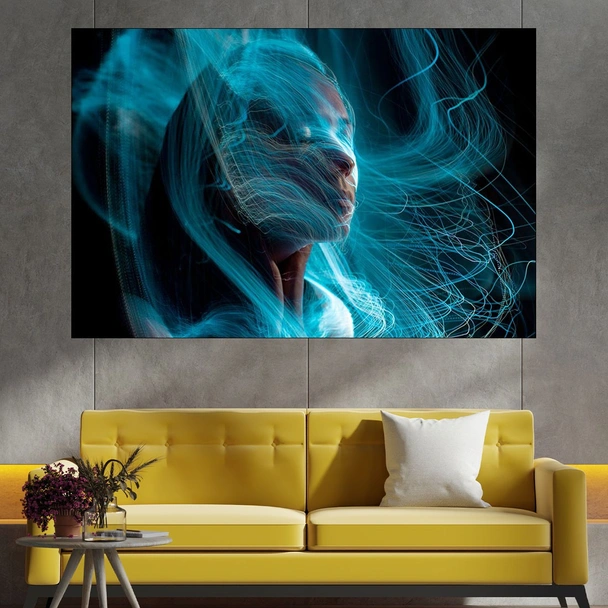 Декорация за стена (картина, пано) с мотив "Женско лице - абстракция - картина пано за стена". Изработена от олекотено PVC с дебелина 5 мм или канава от 100% памук, опъната върху дървена подрамка с дебелина 5 см. Изображението се печата с висококачествен UV печат, което е гаранция за запазване на цветовете с години!