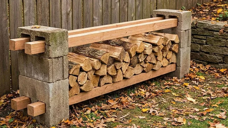 Използването на бетонни блокчета и дървени греди 5х10 см е може би най-бързото и бюджетно решение за съхранение, познато на „направи си сам“ ентусиастите. Конструкцията е гениално проста: поставяте две блокчета на земята и вкарвате вертикално дървените греди в отворите им, след което ги свързвате с хоризонтални летви за стабилност. Този метод не изисква никакви пирони, винтове или пробиване, което го прави изпълним дори за хора без технически умения. Бетонът изолира дървесината от влагата на почвата, а тежестта на нацепените дърва прави конструкцията изключително стабилна с времето. Освен това, тази система е модулна – можете лесно да я разглобите и преместите през лятото.