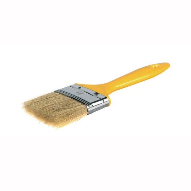 Инструментът разполага с лека пластмасова дръжка в отличителен жълт цвят, която е устойчива на влага и агресивни химикали. Ергономичният дизайн на дръжката осигурява добър баланс, което е критично при работа с такава голяма четка, за да се намали умората в ръката. За да съхраните естествения косъм на четката, е важно тя да бъде измивана старателно веднага след употреба. При маслени бои използвайте подходящ разредител, а при латекс и емулсии – топла сапунена вода. Правилната грижа гарантира, че влакната ще запазят своята еластичност и мекота за многократна употреба.