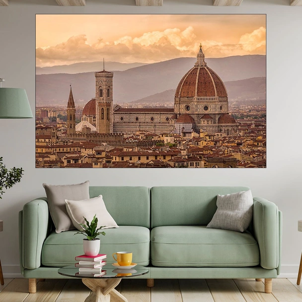 Декорация за стена (картина, пано) с мотив "Изглед над Флоренция - картина пано за стена". Изработена от олекотено PVC с дебелина 5 мм или канава от 100% памук, опъната върху дървена подрамка с дебелина 5 см. Изображението се печата с висококачествен UV печат, което е гаранция за запазване на цветовете с години!