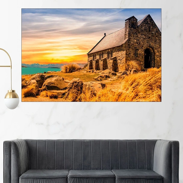 Декорация за стена (картина, пано) с мотив "Каменна църква край езерото - картина пано за стена". Изработена от олекотено PVC с дебелина 5 мм или канава от 100% памук, опъната върху дървена подрамка с дебелина 5 см. Изображението се печата с висококачествен UV печат, което е гаранция за запазване на цветовете с години!