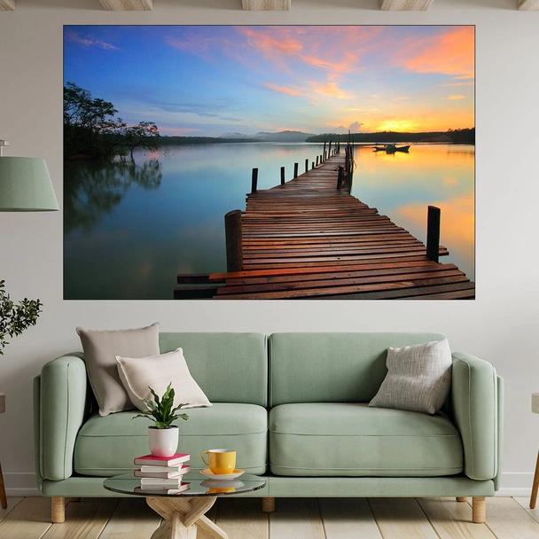 Декорация за стена (картина, пано) с мотив "Дървен кей в езерото - картина пано за стена". Изработена от олекотено PVC с дебелина 5 мм или канава от 100% памук, опъната върху дървена подрамка с дебелина 5 см. Изображението се печата с висококачествен UV печат, което е гаранция за запазване на цветовете с години!