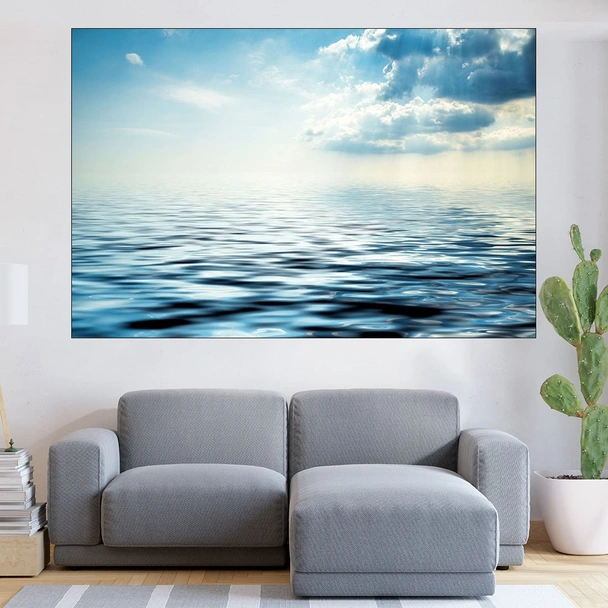 Декорация за стена (картина, пано) с мотив "Облаци над синьо езеро - картина пано за стена". Изработена от олекотено PVC с дебелина 5 мм или канава от 100% памук, опъната върху дървена подрамка с дебелина 5 см. Изображението се печата с висококачествен UV печат, което е гаранция за запазване на цветовете с години!