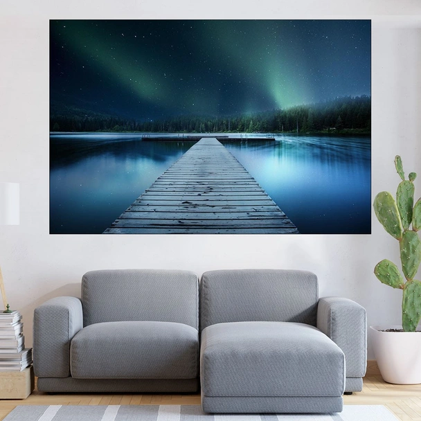 Декорация за стена (картина, пано) с мотив "Пейзаж на дървен мост в езеро - картина пано за стена". Изработена от олекотено PVC с дебелина 5 мм или канава от 100% памук, опъната върху дървена подрамка с дебелина 5 см. Изображението се печата с висококачествен UV печат, което е гаранция за запазване на цветовете с години!