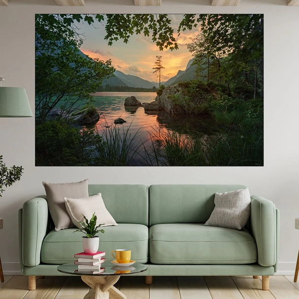 Декорация за стена (картина, пано) с мотив "Живописно езеро в Алпите - картина пано за стена". Изработена от олекотено PVC с дебелина 5 мм или канава от 100% памук, опъната върху дървена подрамка с дебелина 5 см. Изображението се печата с висококачествен UV печат, което е гаранция за запазване на цветовете с години!