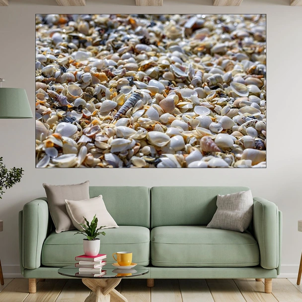 Декорация за стена (картина, пано) с мотив "Мидени черупки на плажа - картина пано за стена". Изработена от олекотено PVC с дебелина 5 мм или канава от 100% памук, опъната върху дървена подрамка с дебелина 5 см. Изображението се печата с висококачествен UV печат, което е гаранция за запазване на цветовете с години!