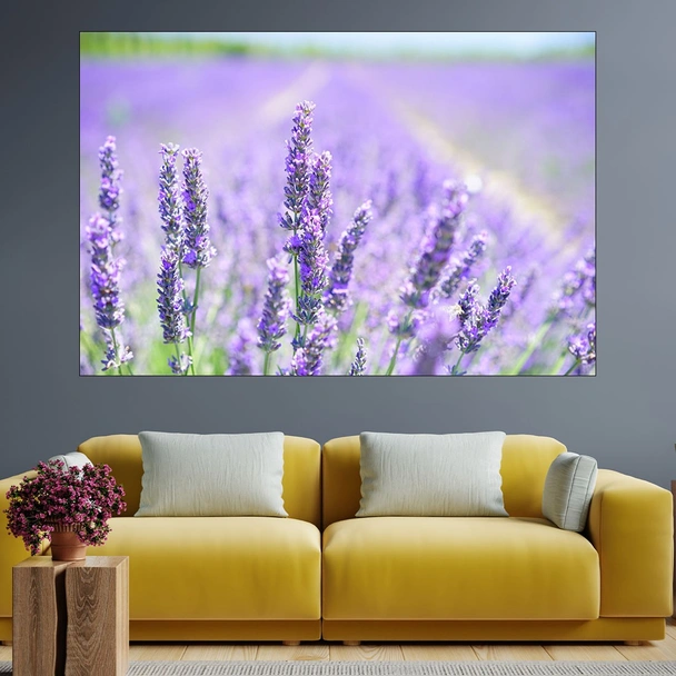 Декорация за стена (картина, пано) с мотив "Цъфнала лавандула - картина пано за стена". Изработена от олекотено PVC с дебелина 5 мм или канава от 100% памук, опъната върху дървена подрамка с дебелина 5 см. Изображението се печата с висококачествен UV печат, което е гаранция за запазване на цветовете с години!