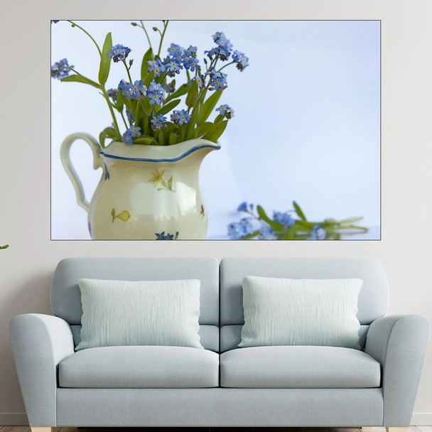 Декорация за стена (картина, пано) с мотив "Сини пролетни цветя във ваза - картина пано за стена". Изработена от олекотено PVC с дебелина 5 мм или канава от 100% памук, опъната върху дървена подрамка с дебелина 5 см. Изображението се печата с висококачествен UV печат, което е гаранция за запазване на цветовете с години!