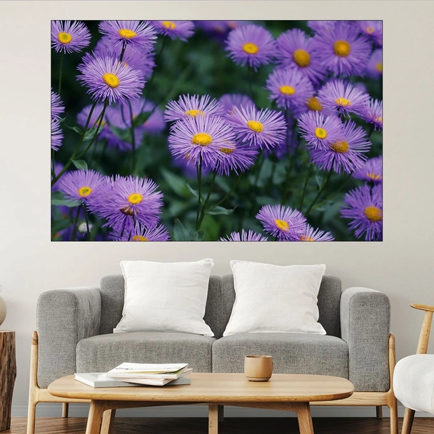 Декорация за стена (картина, пано) с мотив "Виолетови астри - картина пано за стена". Изработена от олекотено PVC с дебелина 5 мм или канава от 100% памук, опъната върху дървена подрамка с дебелина 5 см. Изображението се печата с висококачествен UV печат, което е гаранция за запазване на цветовете с години!