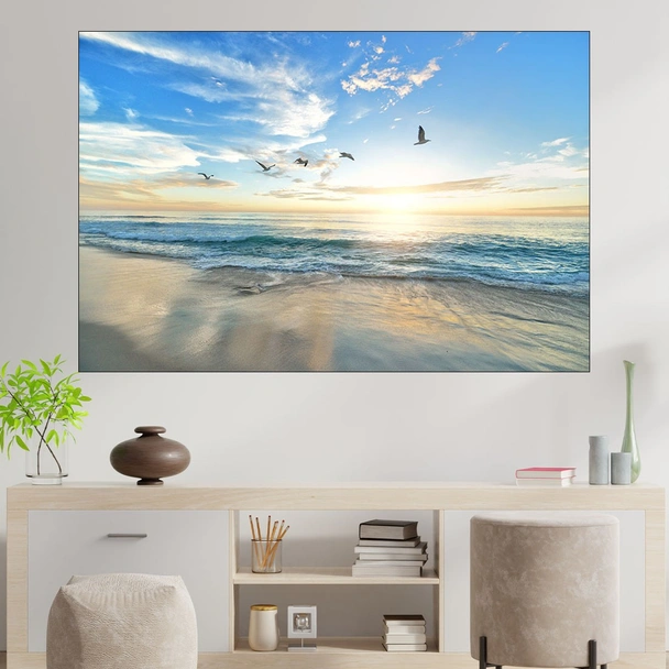 Декорация за стена (картина, пано) с мотив "Изгрев и птици край морето - картина пано за стена". Изработена от олекотено PVC с дебелина 5 мм или канава от 100% памук, опъната върху дървена подрамка с дебелина 5 см. Изображението се печата с висококачествен UV печат, което е гаранция за запазване на цветовете с години!