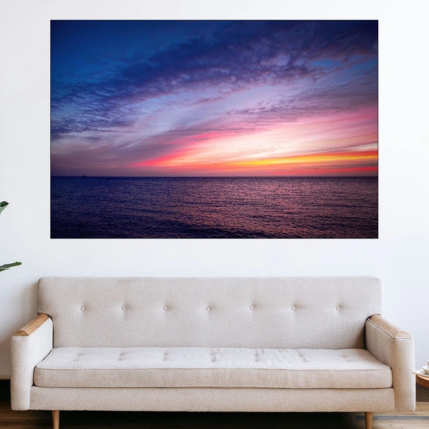 Декорация за стена (картина, пано) с мотив "Изгрев в открито море - картина пано за стена". Изработена от олекотено PVC с дебелина 5 мм или канава от 100% памук, опъната върху дървена подрамка с дебелина 5 см. Изображението се печата с висококачествен UV печат, което е гаранция за запазване на цветовете с години!