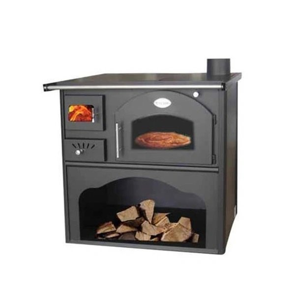 Горивната камера на печката е прецизно облицована с шамотни тухли, които акумулират топлината и осигуряват стабилна температура в помещението дълго след зареждане. Основата на огнището е снабдена със здрава чугунена скара, гарантираща устойчивост при високи натоварвания. С мощност от 7 kW, уредът лесно затопля средно големи помещения, като същевременно предоставя достатъчно енергия за печене във фурната с впечатляващи размери (25x42x44 см).