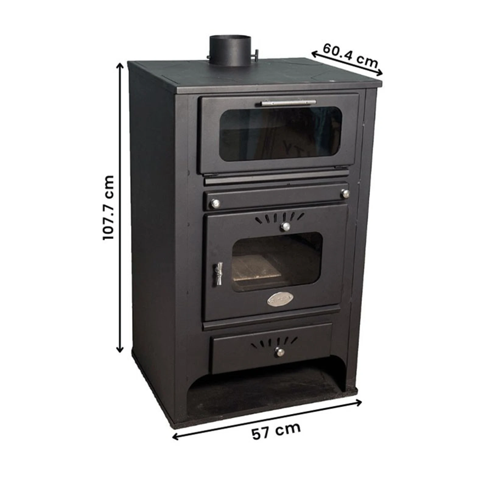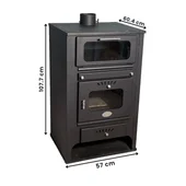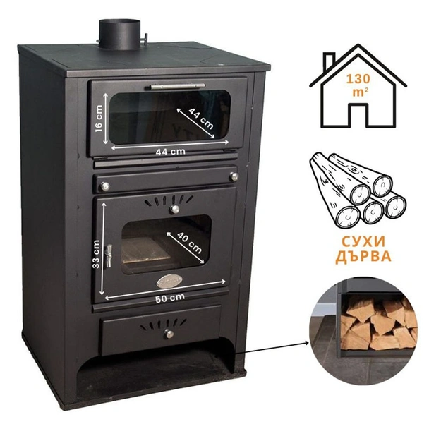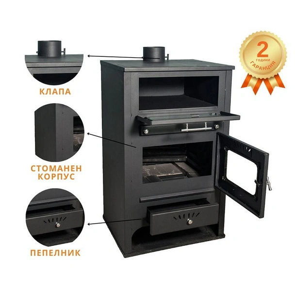 Едно от основните предимства на този модел е интегрираната фурна за готвене, която позволява пълноценно използване на топлинната енергия. Фурната е оборудвана със закалено стъкло и прецизен термометър, което улеснява контрола върху кулинарните процеси. Горивната камера разполага с висококачествена термошокова стъклокерамика, издържаща на екстремни температури до 850°C. В долната част на уреда е предвидена практична ниша за съхранение и предварително изсушаване на дърва, което оптимизира процеса на горене.