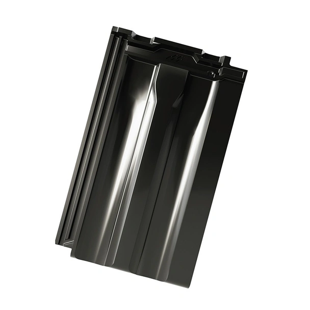 Гланцираното енгобирано покритие в черен цвят придава дълбок, наситен и елегантен нюанс с лек блясък, който отразява светлината и подчертава чистите линии на покрива. Този цвят е особено популярен в съвременната архитектура – създава контраст с фасадата и придава усещане за лукс и минимализъм. Пресоването в гипсови калъпи осигурява остри, прецизни ръбове и идеална гладкост, а дълбоките двойни прегъвания гарантират пълно уплътняване срещу проникване на вода и вятър.