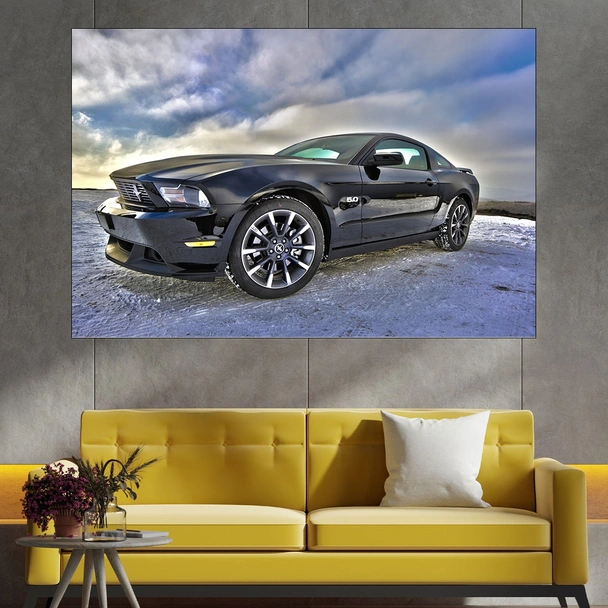 Декорация за стена (картина, пано) с мотив "Форд Мустанг - картина пано за стена". Изработена от олекотено PVC с дебелина 5 мм или канава от 100% памук, опъната върху дървена подрамка с дебелина 5 см. Изображението се печата с висококачествен UV печат, което е гаранция за запазване на цветовете с години!