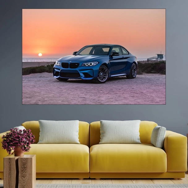 Декорация за стена (картина, пано) с мотив "Синьо BMW и залез - картина пано за стена". Изработена от олекотено PVC с дебелина 5 мм или канава от 100% памук, опъната върху дървена подрамка с дебелина 5 см. Изображението се печата с висококачествен UV печат, което е гаранция за запазване на цветовете с години!