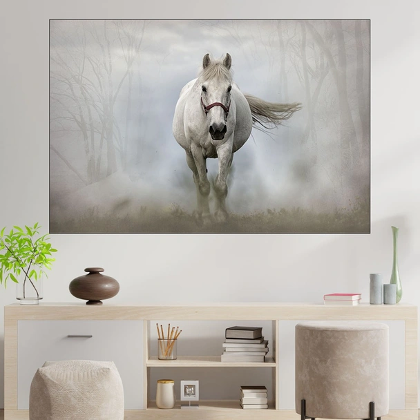 Декорация за стена (картина, пано) с мотив "Бял кон в мъглата - картина пано за стена". Изработена от олекотено PVC с дебелина 5 мм или канава от 100% памук, опъната върху дървена подрамка с дебелина 5 см. Изображението се печата с висококачествен UV печат, което е гаранция за запазване на цветовете с години!