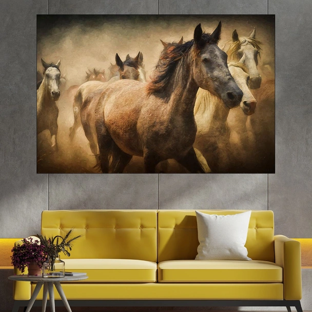 Декорация за стена (картина, пано) с мотив "Коне живопис - картина пано за стена". Изработена от олекотено PVC с дебелина 5 мм или канава от 100% памук, опъната върху дървена подрамка с дебелина 5 см. Изображението се печата с висококачествен UV печат, което е гаранция за запазване на цветовете с години!