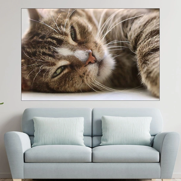Декорация за стена (картина, пано) с мотив "Легнала домашна котка - картина пано за стена". Изработена от олекотено PVC с дебелина 5 мм или канава от 100% памук, опъната върху дървена подрамка с дебелина 5 см. Изображението се печата с висококачествен UV печат, което е гаранция за запазване на цветовете с години!
