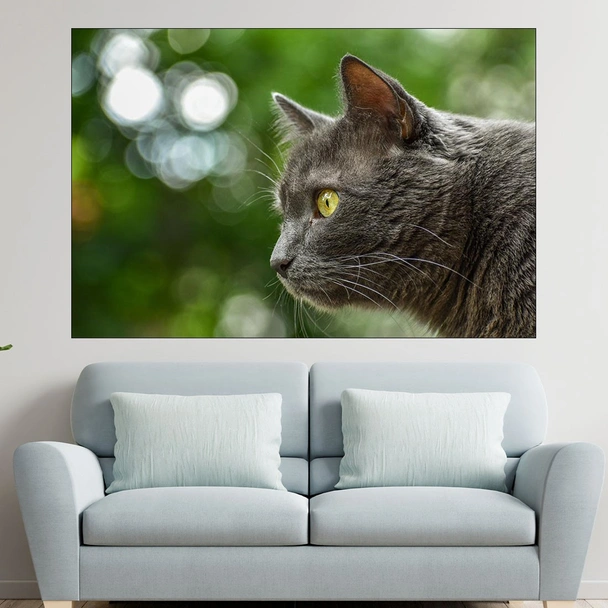 Декорация за стена (картина, пано) с мотив "Вторачено сиво коте - картина пано за стена". Изработена от олекотено PVC с дебелина 5 мм или канава от 100% памук, опъната върху дървена подрамка с дебелина 5 см. Изображението се печата с висококачествен UV печат, което е гаранция за запазване на цветовете с години!