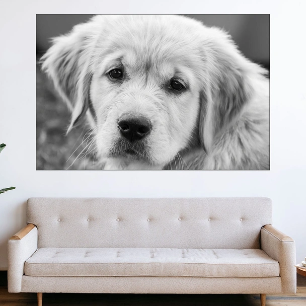 Декорация за стена (картина, пано) с мотив "Близък кадър на голдън ретривър - картина пано за стена". Изработена от олекотено PVC с дебелина 5 мм или канава от 100% памук, опъната върху дървена подрамка с дебелина 5 см. Изображението се печата с висококачествен UV печат, което е гаранция за запазване на цветовете с години!