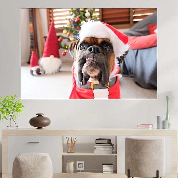 Декорация за стена (картина, пано) с мотив "Боксер в коледна премяна - картина пано за стена". Изработена от олекотено PVC с дебелина 5 мм или канава от 100% памук, опъната върху дървена подрамка с дебелина 5 см. Изображението се печата с висококачествен UV печат, което е гаранция за запазване на цветовете с години!