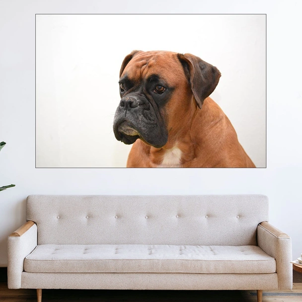 Декорация за стена (картина, пано) с мотив "Kуче боксер - потрет - картина пано за стена". Изработена от олекотено PVC с дебелина 5 мм или канава от 100% памук, опъната върху дървена подрамка с дебелина 5 см. Изображението се печата с висококачествен UV печат, което е гаранция за запазване на цветовете с години!