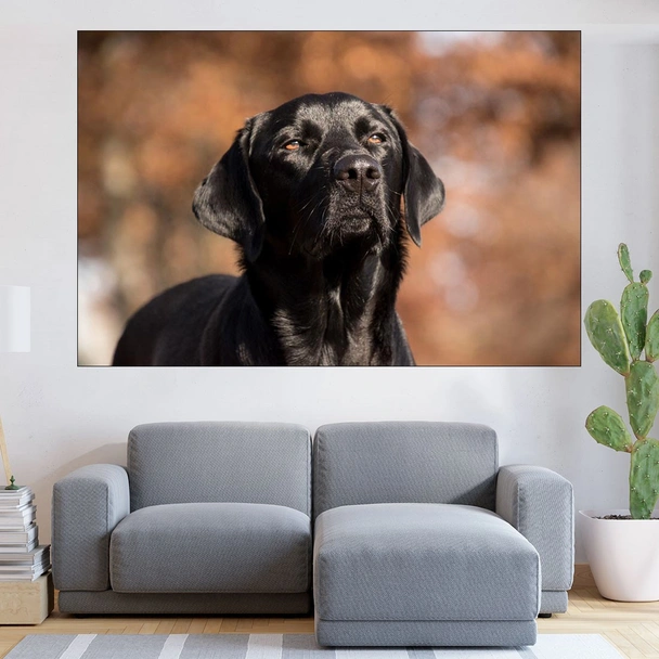 Декорация за стена (картина, пано) с мотив "Портрет на черен лабрадор - картина пано за стена". Изработена от олекотено PVC с дебелина 5 мм или канава от 100% памук, опъната върху дървена подрамка с дебелина 5 см. Изображението се печата с висококачествен UV печат, което е гаранция за запазване на цветовете с години!