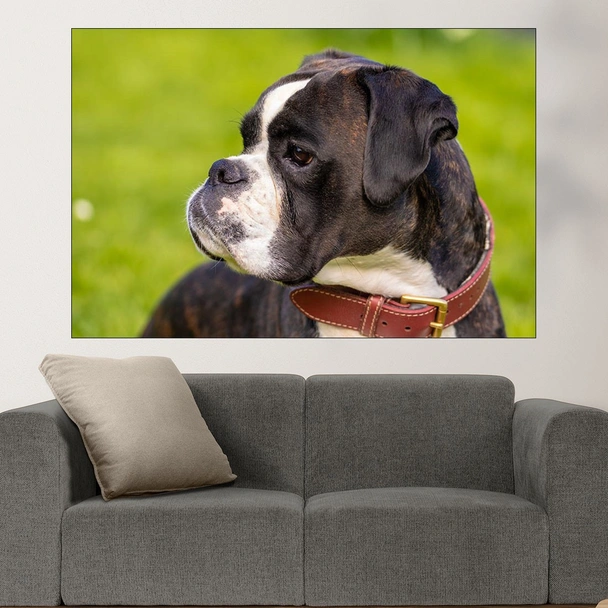 Декорация за стена (картина, пано) с мотив "Портрет на малък черен Боксер - картина пано за стена". Изработена от олекотено PVC с дебелина 5 мм или канава от 100% памук, опъната върху дървена подрамка с дебелина 5 см. Изображението се печата с висококачествен UV печат, което е гаранция за запазване на цветовете с години!