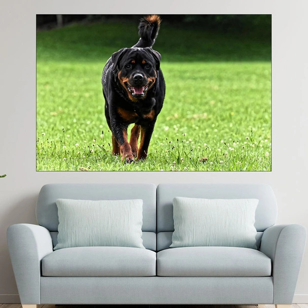 Декорация за стена (картина, пано) с мотив "Ротвайлер на поляната - картина пано за стена". Изработена от олекотено PVC с дебелина 5 мм или канава от 100% памук, опъната върху дървена подрамка с дебелина 5 см. Изображението се печата с висококачествен UV печат, което е гаранция за запазване на цветовете с години!