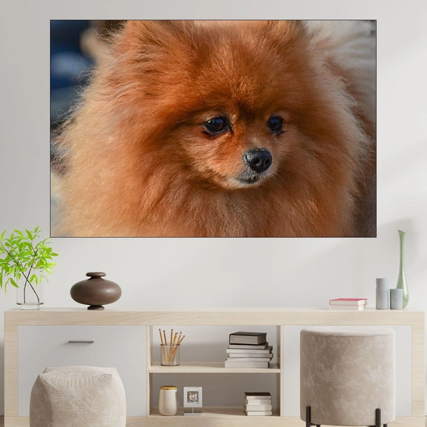 Декорация за стена (картина, пано) с мотив "Сладък померан портрет - картина пано за стена". Изработена от олекотено PVC с дебелина 5 мм или канава от 100% памук, опъната върху дървена подрамка с дебелина 5 см. Изображението се печата с висококачествен UV печат, което е гаранция за запазване на цветовете с години!