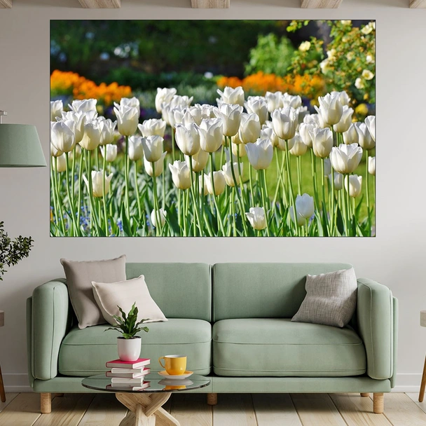 Декорация за стена (картина, пано) с мотив "Цъфнали бели лалета - картина пано за стена". Изработена от олекотено PVC с дебелина 5 мм или канава от 100% памук, опъната върху дървена подрамка с дебелина 5 см. Изображението се печата с висококачествен UV печат, което е гаранция за запазване на цветовете с години!