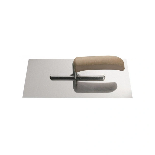 Работният плот на инструмента е изработен от висок клас неръждаема стомана, която се отличава с висока степен на твърдост и пълна устойчивост на корозия. Това е критично предимство, тъй като стоманата не влиза в химическа реакция със строителните смеси и не оставя нежелани петна или следи от ръжда върху светли мазилки. Дръжката е изработена от качествено дърво, което е проектирано с ергономична форма за максимално удобство на дланта. Естествената повърхност на дървото осигурява сигурен захват и предотвратява приплъзването, което значително намалява умората в китката и предмишницата при продължителни работни сесии.