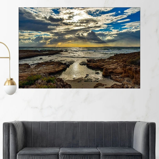 Декорация за стена (картина, пано) с мотив "Красиво небе над брега - картина пано за стена". Изработена от олекотено PVC с дебелина 5 мм или канава от 100% памук, опъната върху дървена подрамка с дебелина 5 см. Изображението се печата с висококачествен UV печат, което е гаранция за запазване на цветовете с години!