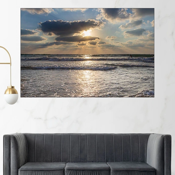 Декорация за стена (картина, пано) с мотив "Облаци и слънце над морето - картина пано за стена". Изработена от олекотено PVC с дебелина 5 мм или канава от 100% памук, опъната върху дървена подрамка с дебелина 5 см. Изображението се печата с висококачествен UV печат, което е гаранция за запазване на цветовете с години!
