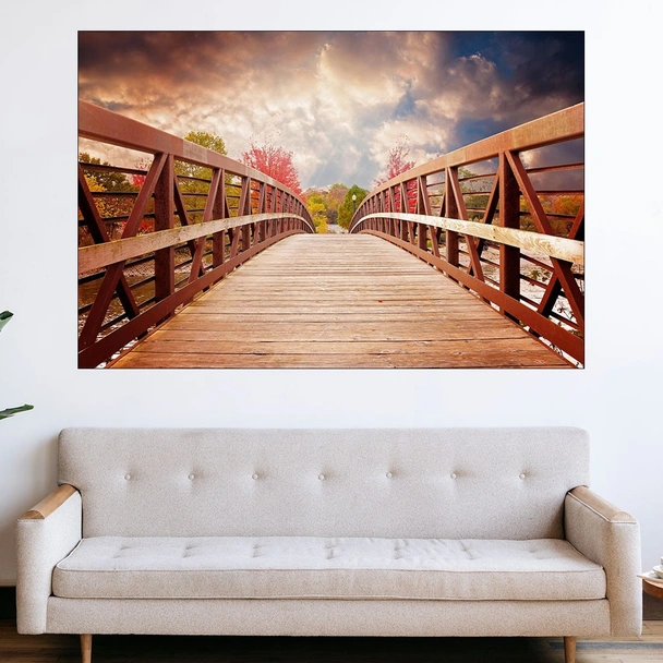 Декорация за стена (картина, пано) с мотив "Дървен мост през есентта - картина пано за стена". Изработена от олекотено PVC с дебелина 5 мм или канава от 100% памук, опъната върху дървена подрамка с дебелина 5 см. Изображението се печата с висококачествен UV печат, което е гаранция за запазване на цветовете с години!