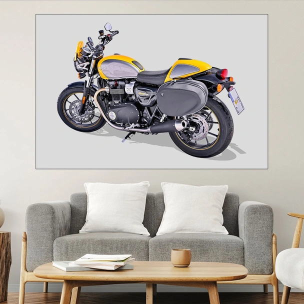 Декорация за стена (картина, пано) с мотив "Мотциклет Триумф - картина пано за стена". Изработена от олекотено PVC с дебелина 5 мм или канава от 100% памук, опъната върху дървена подрамка с дебелина 5 см. Изображението се печата с висококачествен UV печат, което е гаранция за запазване на цветовете с години!