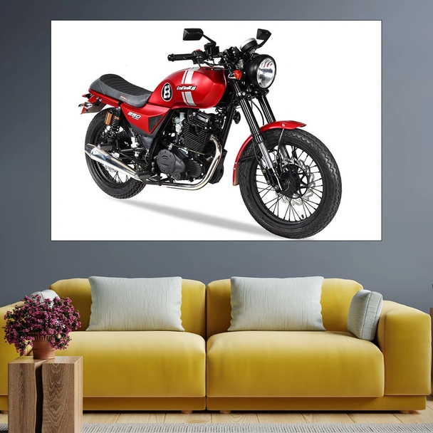 Декорация за стена (картина, пано) с мотив "Мотоциклет Infinity 250 - картина пано за стена". Изработена от олекотено PVC с дебелина 5 мм или канава от 100% памук, опъната върху дървена подрамка с дебелина 5 см. Изображението се печата с висококачествен UV печат, което е гаранция за запазване на цветовете с години!