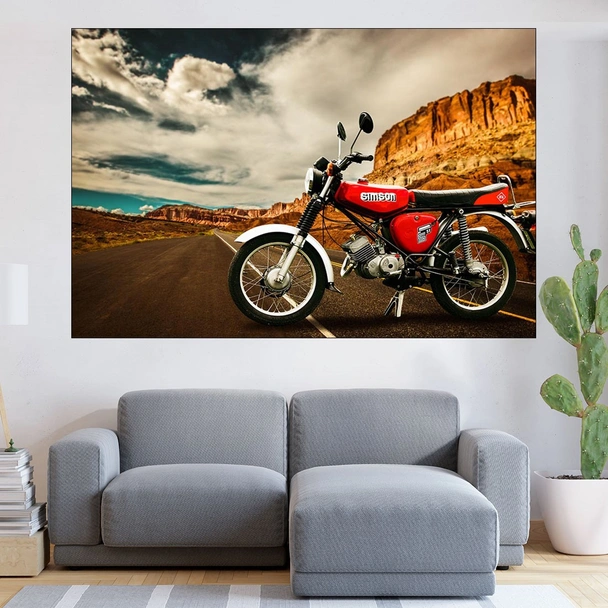 Декорация за стена (картина, пано) с мотив "Мотор Simson на пътя - картина пано за стена". Изработена от олекотено PVC с дебелина 5 мм или канава от 100% памук, опъната върху дървена подрамка с дебелина 5 см. Изображението се печата с висококачествен UV печат, което е гаранция за запазване на цветовете с години!