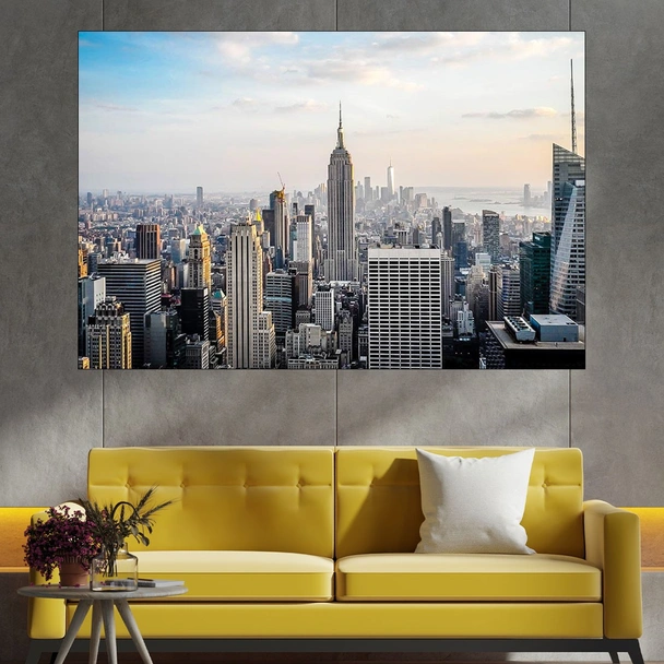 Декорация за стена (картина, пано) с мотив "Ню Йорк - птичи поглед над Манхатън - картина пано за стена". Изработена от олекотено PVC с дебелина 5 мм или канава от 100% памук, опъната върху дървена подрамка с дебелина 5 см. Изображението се печата с висококачествен UV печат, което е гаранция за запазване на цветовете с години!