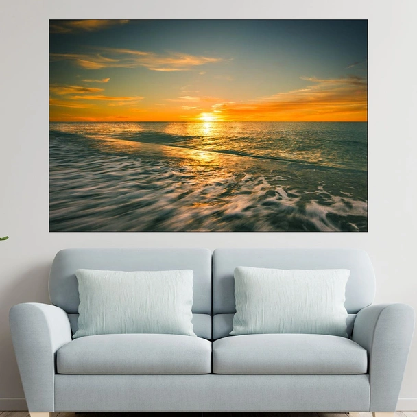 Декорация за стена (картина, пано) с мотив "Залез над Тихи океан - картина пано за стена". Изработена от олекотено PVC с дебелина 5 мм или канава от 100% памук, опъната върху дървена подрамка с дебелина 5 см. Изображението се печата с висококачествен UV печат, което е гаранция за запазване на цветовете с години!