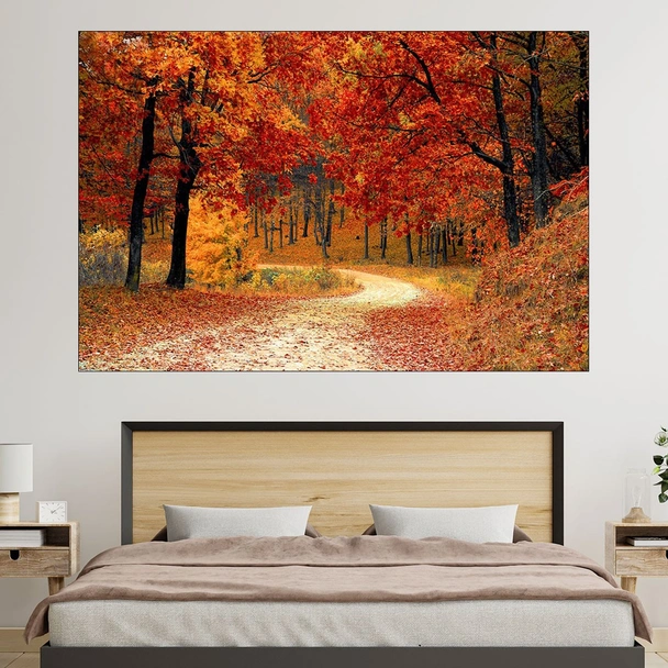 Декорация за стена (картина, пано) с мотив "Живописна пътека в гората - картина пано за стена". Изработена от олекотено PVC с дебелина 5 мм или канава от 100% памук, опъната върху дървена подрамка с дебелина 5 см. Изображението се печата с висококачествен UV печат, което е гаранция за запазване на цветовете с години!
