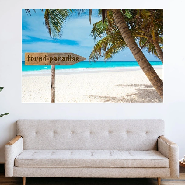 Декорация за стена (картина, пано) с мотив "Тропически остров с плаж и палми - картина пано за стена". Изработена от олекотено PVC с дебелина 5 мм или канава от 100% памук, опъната върху дървена подрамка с дебелина 5 см. Изображението се печата с висококачествен UV печат, което е гаранция за запазване на цветовете с години!