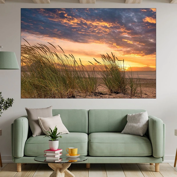Декорация за стена (картина, пано) с мотив "Тръстика на плажа - картина пано за стена". Изработена от олекотено PVC с дебелина 5 мм или канава от 100% памук, опъната върху дървена подрамка с дебелина 5 см. Изображението се печата с висококачествен UV печат, което е гаранция за запазване на цветовете с години!