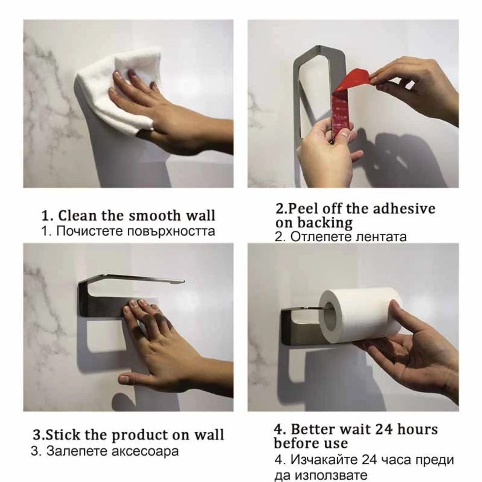 Монтажът на този аксесоар е изключително бърз и удобен. Вместо традиционното пробиване на стената, поставката се закрепва с помощта на здрава двойнозалепяща 3M - VHB лента. Този метод е идеален за тези, които искат да избегнат увреждане на плочките или стените. Просто почистете добре повърхността, отстранете защитното фолио и притиснете здраво поставката за няколко секунди. Уверете се, че повърхността е суха и чиста, преди да започнете монтажа, за да осигурите максимална здравина на залепването.