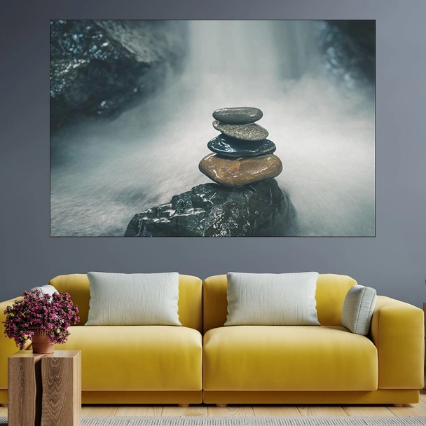 Декорация за стена (картина, пано) с мотив "Баланс от камъни и водопад - картина пано за стена". Изработена от олекотено PVC с дебелина 5 мм или канава от 100% памук, опъната върху дървена подрамка с дебелина 5 см. Изображението се печата с висококачествен UV печат, което е гаранция за запазване на цветовете с години!