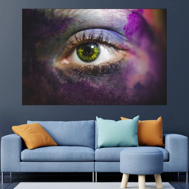 Декорация за стена (картина, пано) с мотив "Човешко око от близо - картина пано за стена". Изработена от олекотено PVC с дебелина 5 мм или канава от 100% памук, опъната върху дървена подрамка с дебелина 5 см. Изображението се печата с висококачествен UV печат, което е гаранция за запазване на цветовете с години!