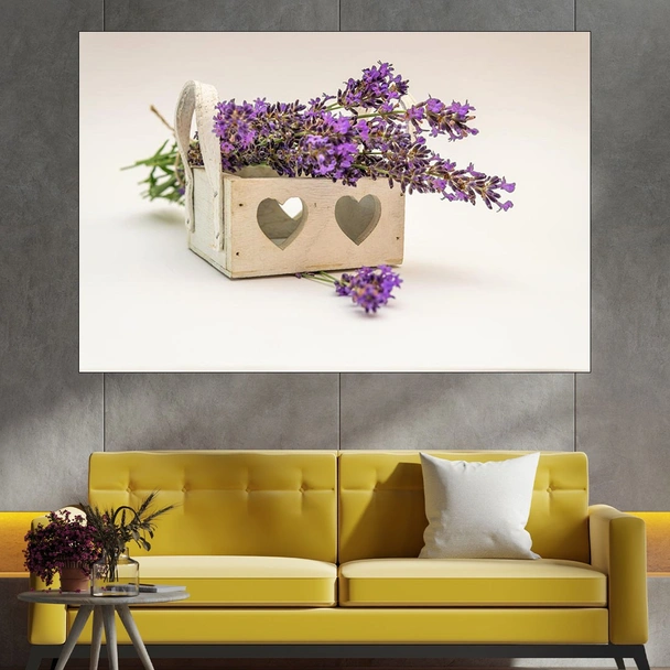 Декорация за стена (картина, пано) с мотив "Лавандула - декорация със сърца - картина пано за стена". Изработена от олекотено PVC с дебелина 5 мм или канава от 100% памук, опъната върху дървена подрамка с дебелина 5 см. Изображението се печата с висококачествен UV печат, което е гаранция за запазване на цветовете с години!