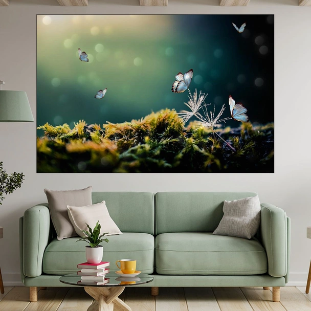 Декорация за стена (картина, пано) с мотив "Летящи сини пеперуди - картина пано за стена". Изработена от олекотено PVC с дебелина 5 мм или канава от 100% памук, опъната върху дървена подрамка с дебелина 5 см. Изображението се печата с висококачествен UV печат, което е гаранция за запазване на цветовете с години!