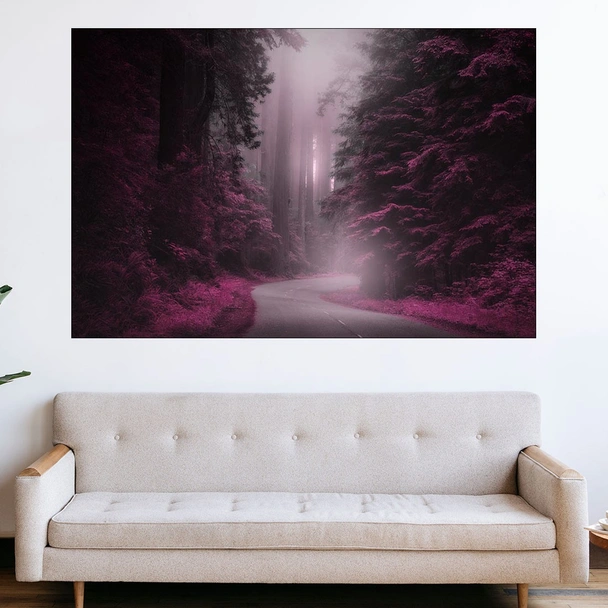 Декорация за стена (картина, пано) с мотив "Магически път в гората - картина пано за стена". Изработена от олекотено PVC с дебелина 5 мм или канава от 100% памук, опъната върху дървена подрамка с дебелина 5 см. Изображението се печата с висококачествен UV печат, което е гаранция за запазване на цветовете с години!